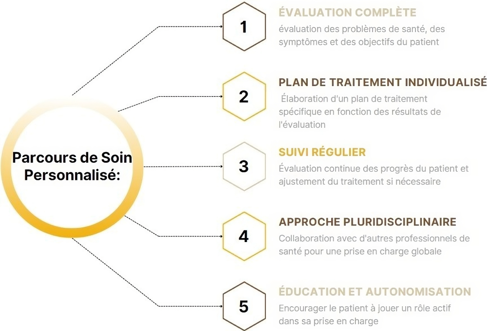 Celle-ci intègre un parcours de soins personnalisé qui débute par une évaluation approfondie. Elle est conçue afin de comprendre les besoins spécifiques, elle permet de dresser un tableau précis de votre état de santé et de mettre en évidence vos forces et faiblesses.